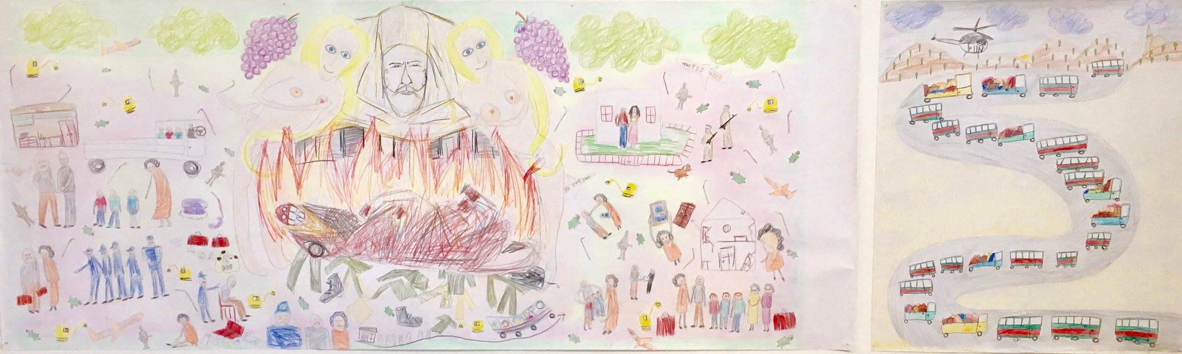 Coming from a great interest in controversy, especially when it has to do with political memory, or the discursive overlap of politics and aesthetics, I conclude that the danger here isn’t one of censorship. The issue is the idea that Nurtane’s piece may need to be **guarded. The actual thing at stake is a matter of walls. It follows a theme of solidifying divisions and securitisation on a massive scale. And this is interesting in its connection with cultural mega-events (think of the militarisation of Rio and the Olympics for example). The idea that the piece may need to be guarded is also interesting because securitisation is one of the fears Nurtane’s work comes from (see here her previous work in the series, which was also controversial in the north), and this fear is also present in this new piece: it’s about symbols, monuments of fathers and military code-names watching over a fire with teeth, and people being put into buses and taken away.